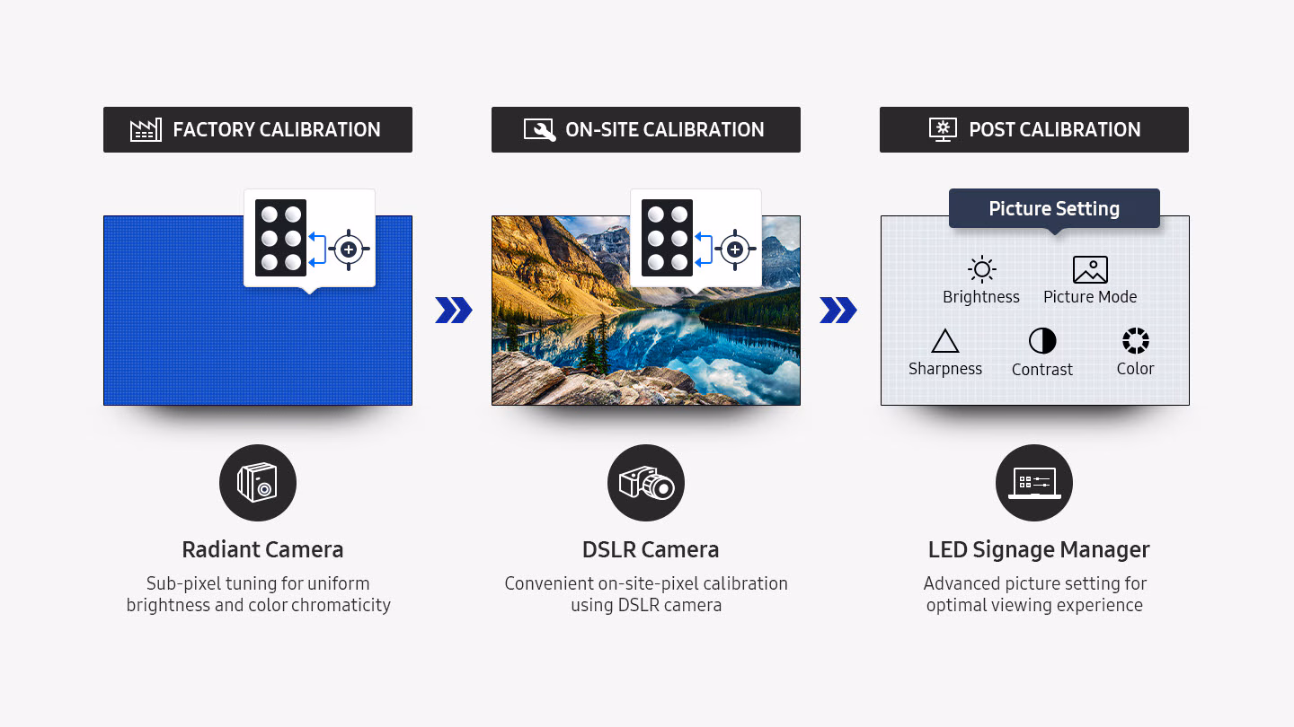 La rigorosa calibración de fábrica y la calibración de subpíxeles de cámara DSLR en tiempo real afinan todos los subpíxeles para lograr un brillo uniforme y una cromaticidad de color. Cuando se combina con la configuración avanzada de imágenes de Samsung LED Signage Manager, este tratamiento mejorado produce una presentación excelente.