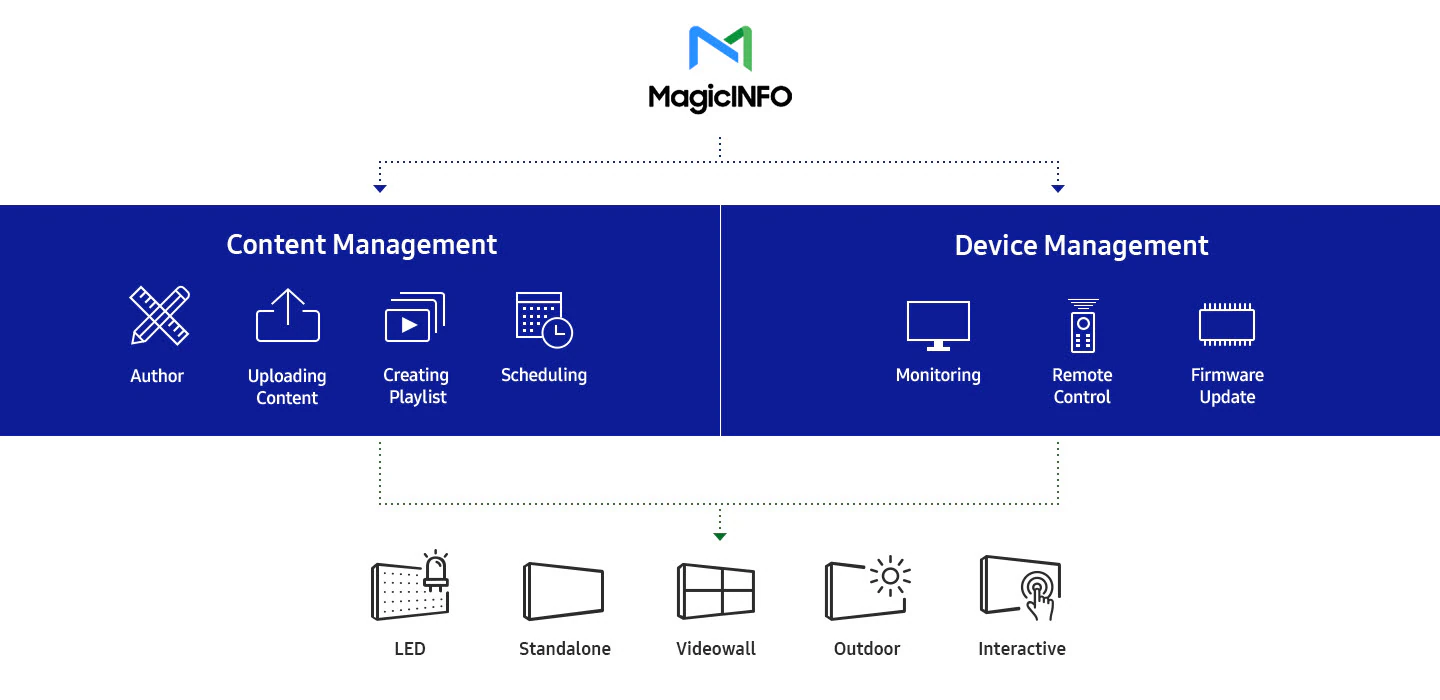 La compatibilidad con la plataforma MagicINFO les permite a los usuarios de la serie IEA elaborar, programar e implementar contenido en toda una red de señalización. Los usuarios también pueden monitorear y ajustar la configuración de la pantalla y solucionar posibles problemas de rendimiento desde cualquier ubicación a través del acceso remoto.