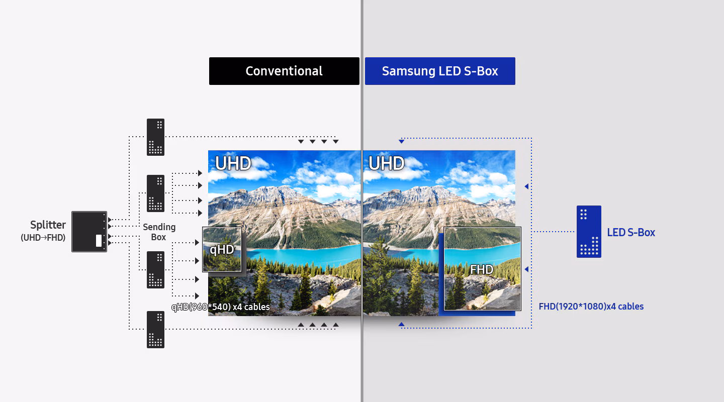 La LED Signage Box (S-Box) condensa la entrega de contenido en un único dispositivo centralizado. La S-Box transmite contenidos en UHD a través de varias pantallas LED sin necesidad de cajas o divisores externos, lo que ayuda a las empresas a mejorar la rapidez y la rentabilidad de sus operaciones.