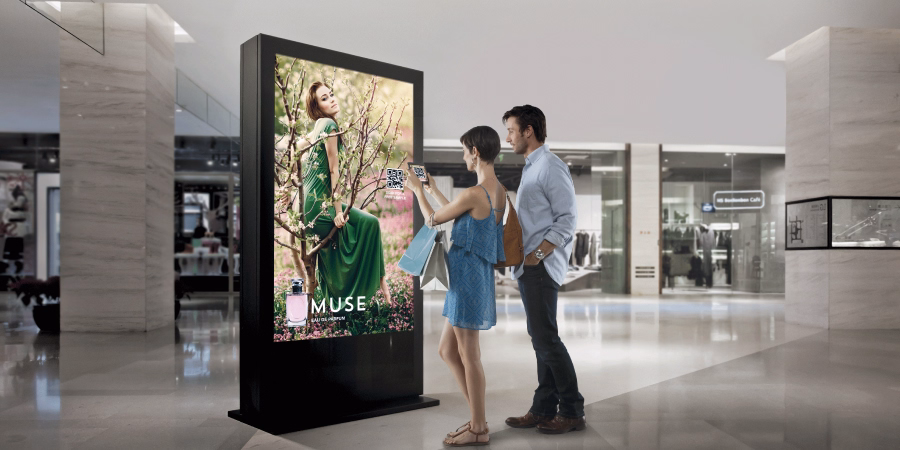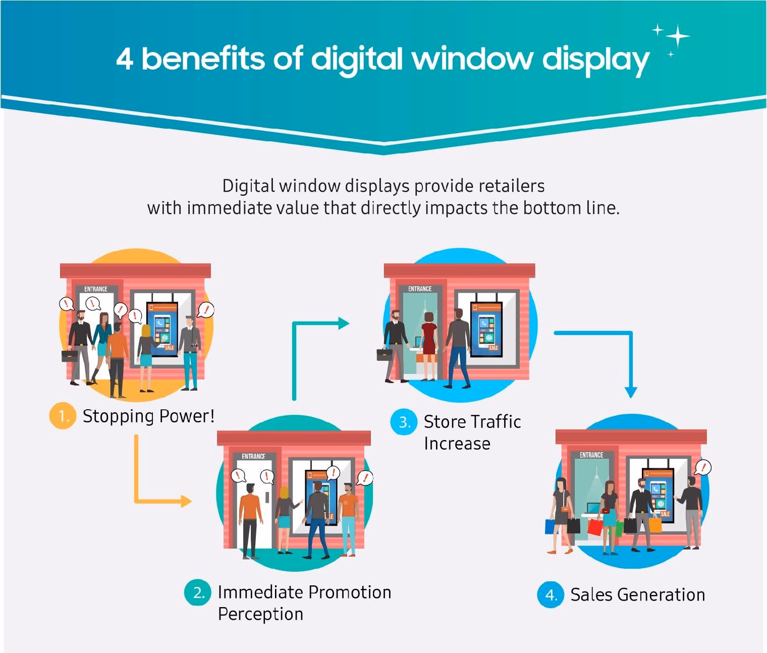 Samsung resolvió ese problema con una pantalla superdelgada adosada , utilizando una pantalla LCD de alto brillo orientada hacia la calle y una pantalla digital más convencional orientada hacia la tienda. Estas pantallas duales pueden reproducir el mismo mensaje o reproducir imágenes o videos separados, según las necesidades de comercialización y marketing.